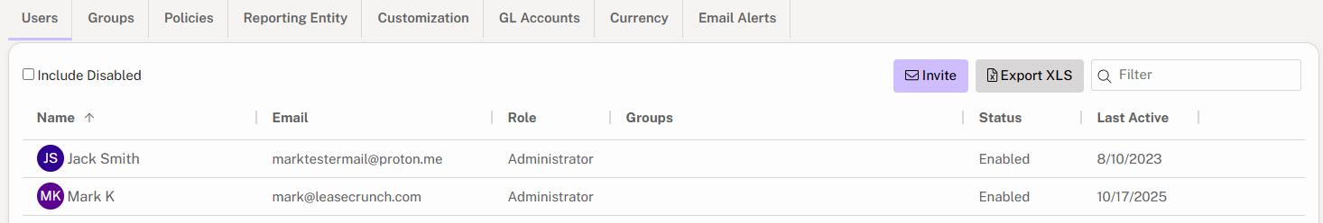 The Administration Tab will now be showing a table displaying all Enabled users.