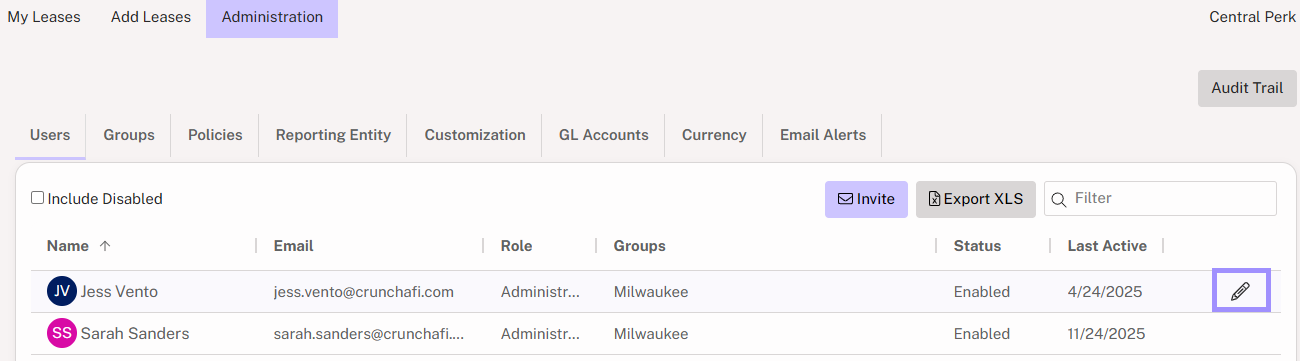 Administrator: This level of access allows the user to make changes to all settings in the account, including enabling and disabling users, inviting new users, and editing all leases, Reporting Entities, and GL Accounts.