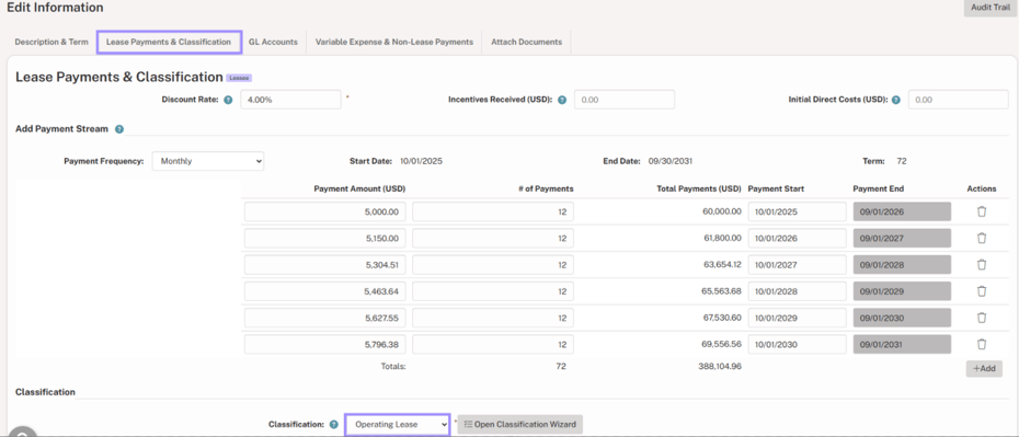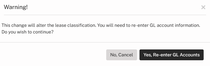 Note: If the classification dropdown is grayed out, the Classification Wizard will need to be used to make changes to the lease classification.