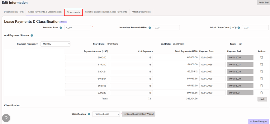 Click the tab, verify and change the GL Accounts as needed, then click Save Changes, and the lease will now be in a completed status.