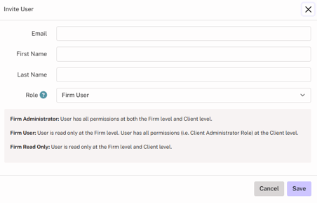 - Firm User: User is read only at the Firm level. User has all permissions (i.e. Client Administrator Role) at the Client level.