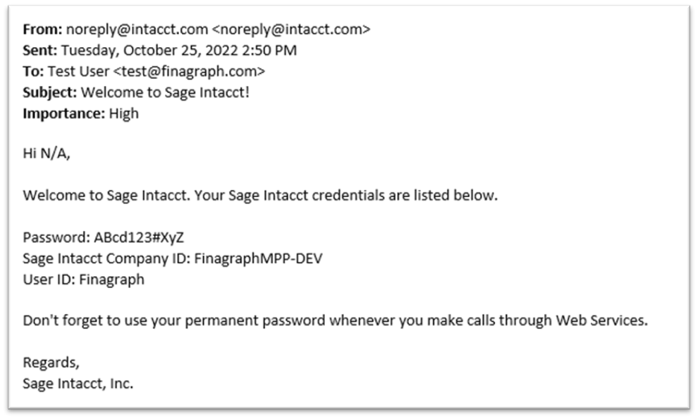 Check your email for the credentials allocated to the Web Services User created in Step 4. These credentials can be used to connect your Sage Intacct company to Crunchafi Data Extraction.