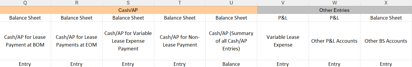 Cash/AP for Variable Lease Expense Payment (Column S) & Cash/AP for Non-Lease Payment (Column T):